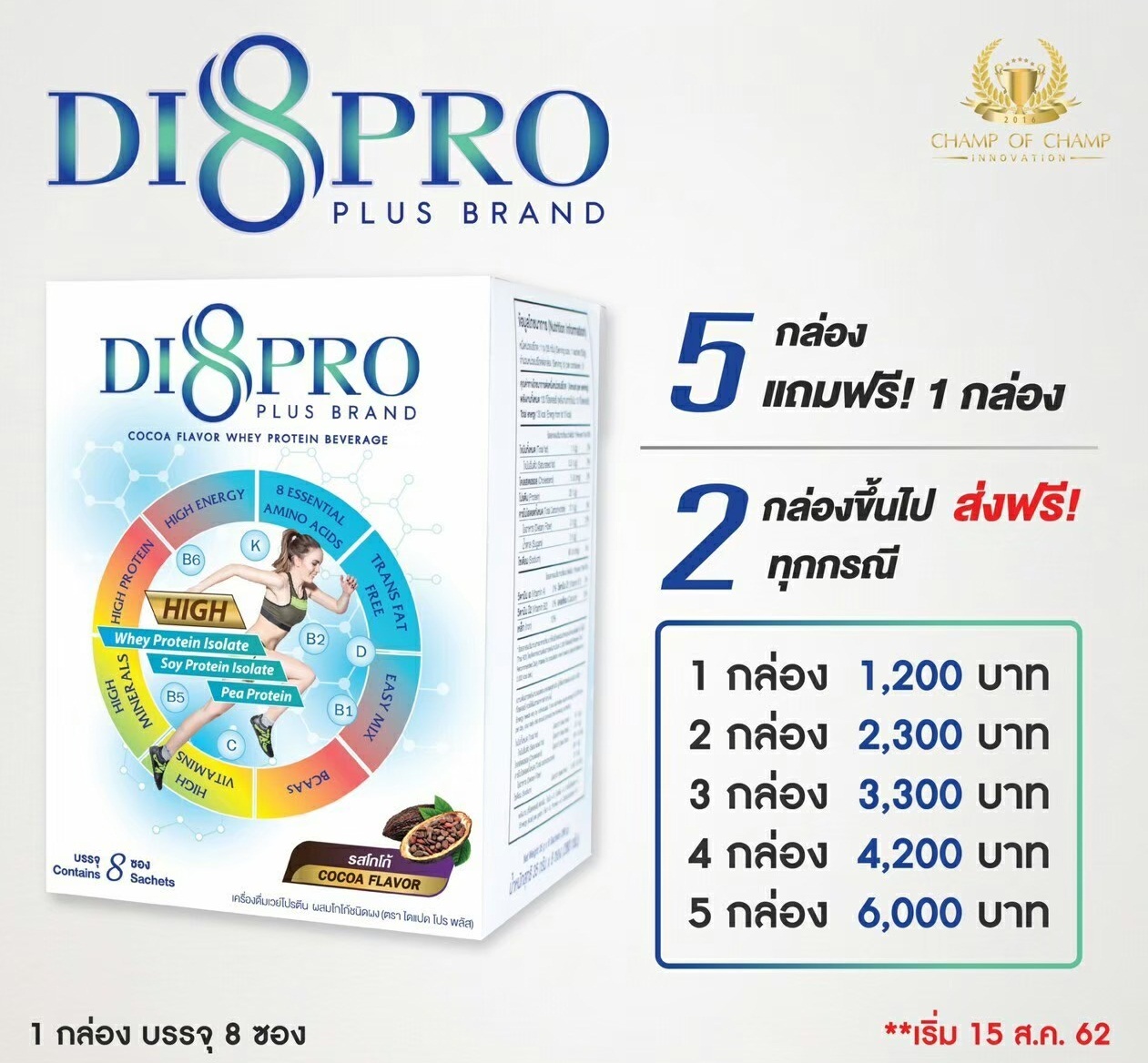 Di 8 Pro Plus : โปรตีน ที่มีกรดอะมิโนที่จำเป็นต่อร่างกายครบ 8 ชนิด ,โปรตีนจากเวย์ไอโซเลตและโปรตีนจากถั่วเหลืองที่จะช่วยในเรื่องของการเสริมสร้างมวลกล้ามเนื้อ,วิตามินเกลือแร่อีกกว่า 8 ชนิดที่จำเป็นต่อร่างกาย